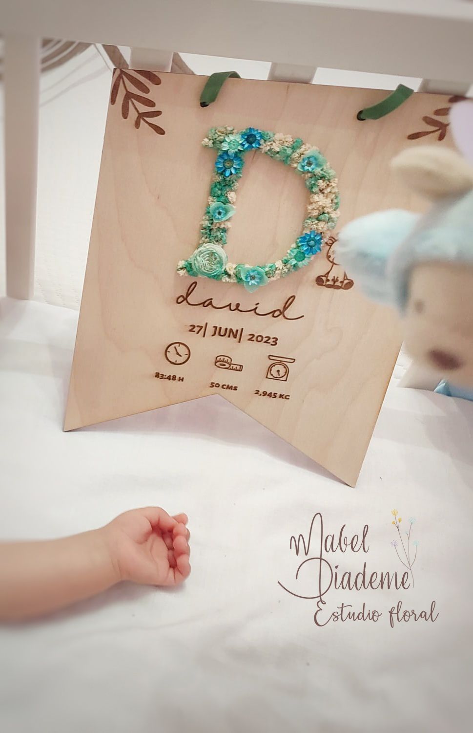 Banderín para bebé regalos bonitos nacimiento inicial flores preservadas