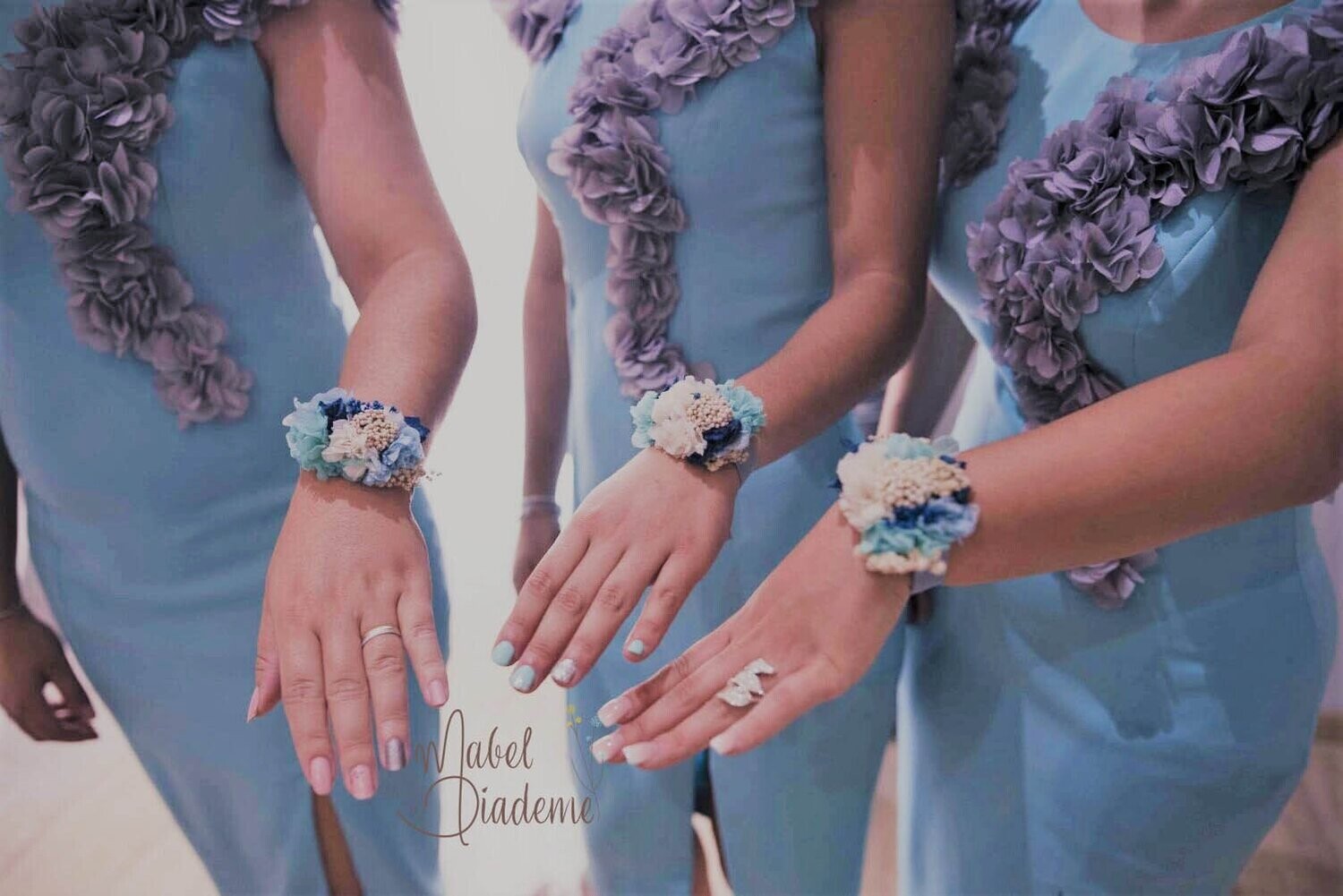 Pulsera de flores preservadas damas de honor, arras en celeste