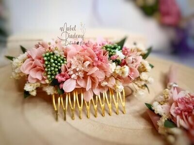 Nuestro tocado de flores preservadas en rosa empolvado está diseñado para novias, niñas de comunión y damitas de arras. Hecho a mano con flores preservadas naturales, es el complemento ideal para un look romántico y elegante.