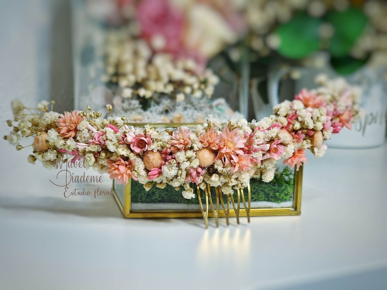 Tiara niña de comunión con peina medida de largo aproximado 16 cm en flor preservada paniculata y flores en rosa empolvado.